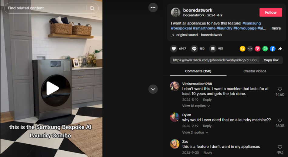 Consumers comment about their concerns on Samsung’s new Bespoke AI Laundry Machine on TikTok.